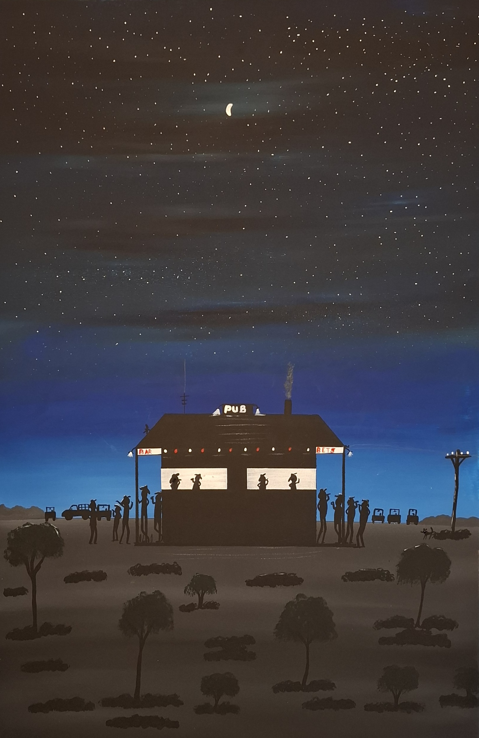 painting ,of a outback pub 60×90 cm night piece ,titled a farkn good night to go out bandicooting hay boys ,ready to hand contact me for a postage cost